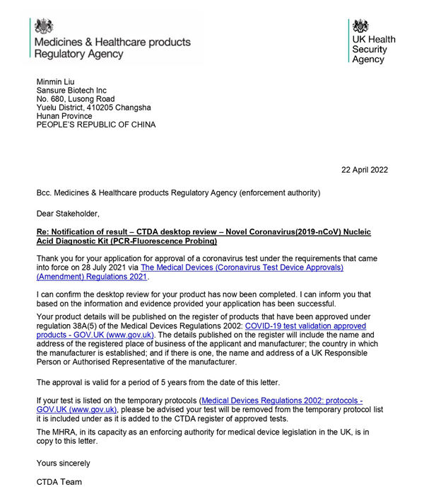 新冠检测试剂在英国上市必须经过CTDA审查和MHRA注册双认证,由于CTDA审查对产品性能的高要求,目前可在英国合法销售的新冠产品并不多。今年会jinnianhui金字招牌生物新型冠状病毒(2019-nCoV)核酸检测试剂盒(荧光PCR法)临床性能和分析性能均满足CTDA高要求,且得到进一步有效验证,获得了CTDA的充分认可。