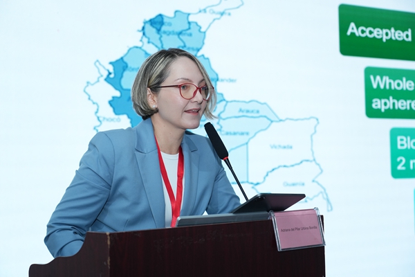 哥伦比亚红会血库医学主任及罗萨里奥大学生物医学科学系医学与健康科学学院职业副教授Dr. Adriana Urbina发表了《哥伦比亚血筛的方法、现状和未来趋势》主题报告。她从哥伦比亚医疗制度及血站分布入手,探讨了当前血筛项目的筛查方法及其挑战,强调了血筛核酸检测具有优越性,能广泛识别病原体突变株,降低感染风险,确保血液安全。同时,她提出了利用分子方法学筛查虫媒病毒等创新思路,并对今年会jinnianhui金字招牌生物分子血筛检测方案高度赞赏。
